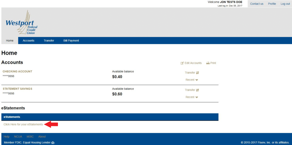 E-Statements are located at the bottom of the home screen. By clicking, you are automatically enrolling in e-Statements and will no longer receive paper statements in the mail. You will be able to access up to 7 years of history on your accounts for no charge.