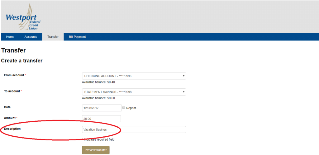 The transfer screen now has the option to include a description of your transfer.
