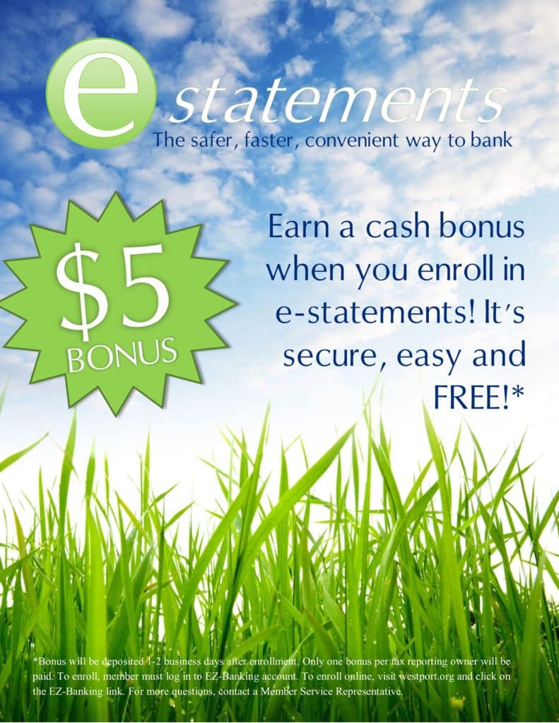 Help us make the world a greener place by going paperless. Not only will your e-statement account help the environment by going paperless, but it will start you off with $5 in your account. Westport Federal Credit Union will put $5 into your account just for going paperless!