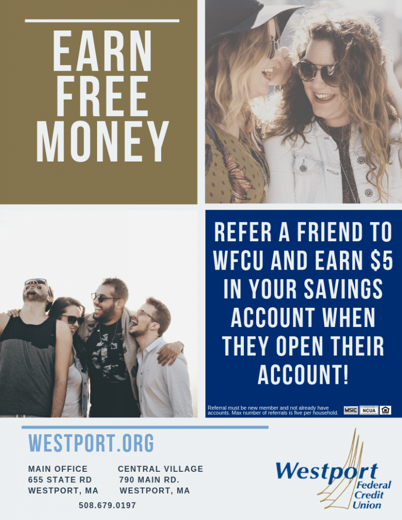 For the entire month of August, Westport Federal Credit Union is offering a Refer-a-Friend program. If you refer a friend and they open an account with WFCU you will receive $5 in your savings account. Yes, just like that! You can earn up to $25 just for telling your friends about us! It’s that simple. Be sure to have your friend let us know that you referred them when they open their account. Visit us at one of our locations or open your account online 24/7 at westport.org.