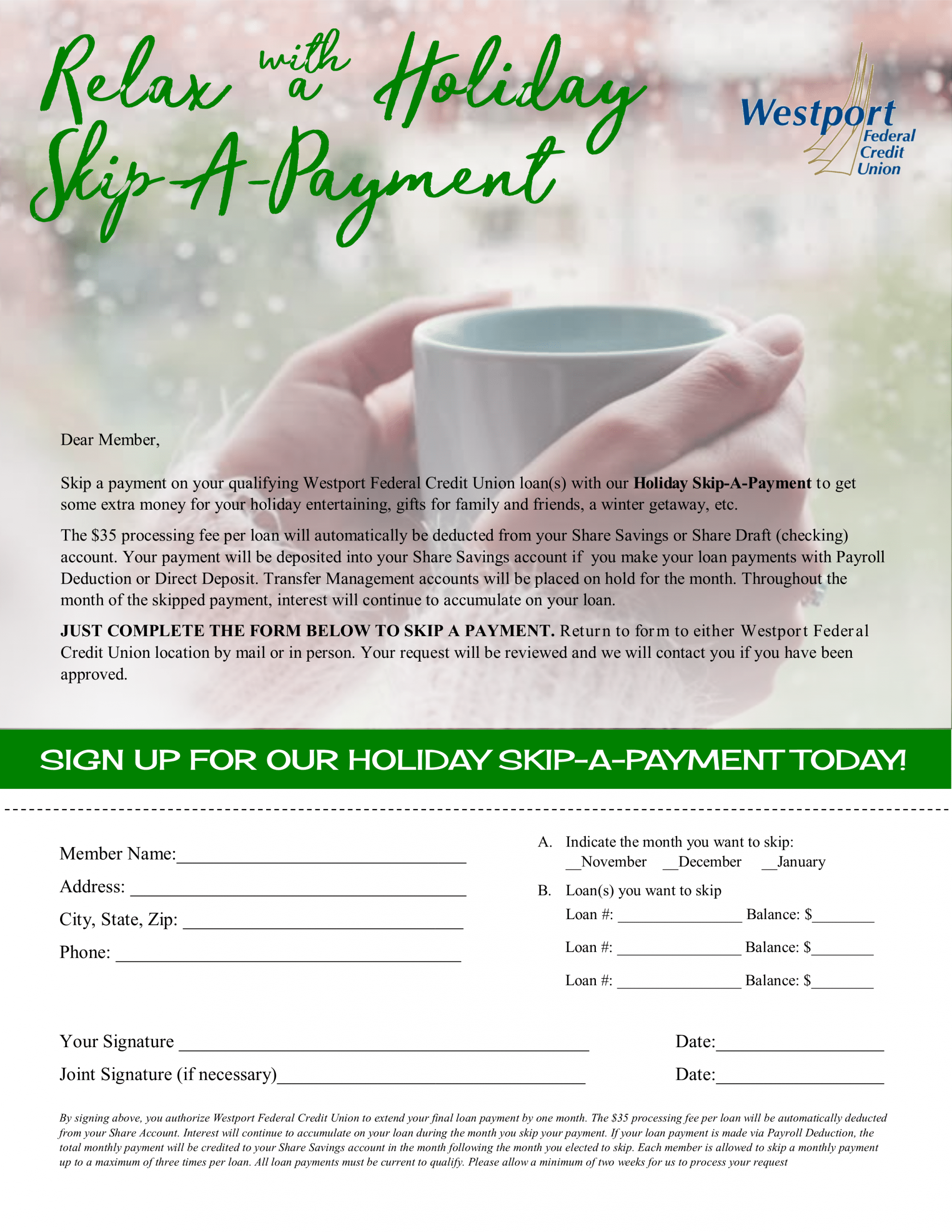 The holidays are here and Westport Federal Credit understands that for some, cash may be tight. We are happy to once again offer our Skip-a-Payment program this holiday season. This will free up some cash for your holiday entertaining, planning a vacation, buying gifts, or whatever else you may need the money for. This will also reduce some stress in your daily life, so you can enjoy the holidays with your loved ones. You can choose the month that will work best for you now through December. Let us help you make the most out of this meaningful time with your loved ones.